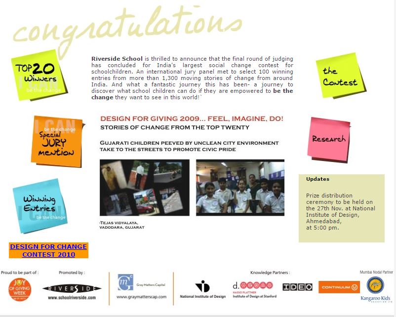 “The Design for Change” contest mission is to empower children, parents, and teachers around the world to be ‘agents of change’; and collaborate to design solutions for a better future by understanding the power of two words: ‘I Can’.