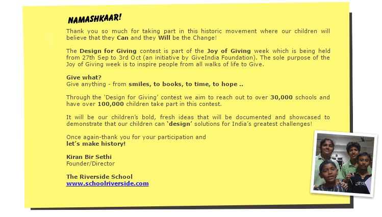 The Design for Giving Contest, originally conceptualized in 2009 by Kiran Bir Sethi, was India’s largest social change contest for schoolchildren, designed to empower young minds to become agents of change. This initiative, which later evolved into the global "Design for Change" movement, aimed to instill a sense of social responsibility in children by encouraging them to design and implement solutions for real-world problems, ranging from environmental issues to education and urban planning.